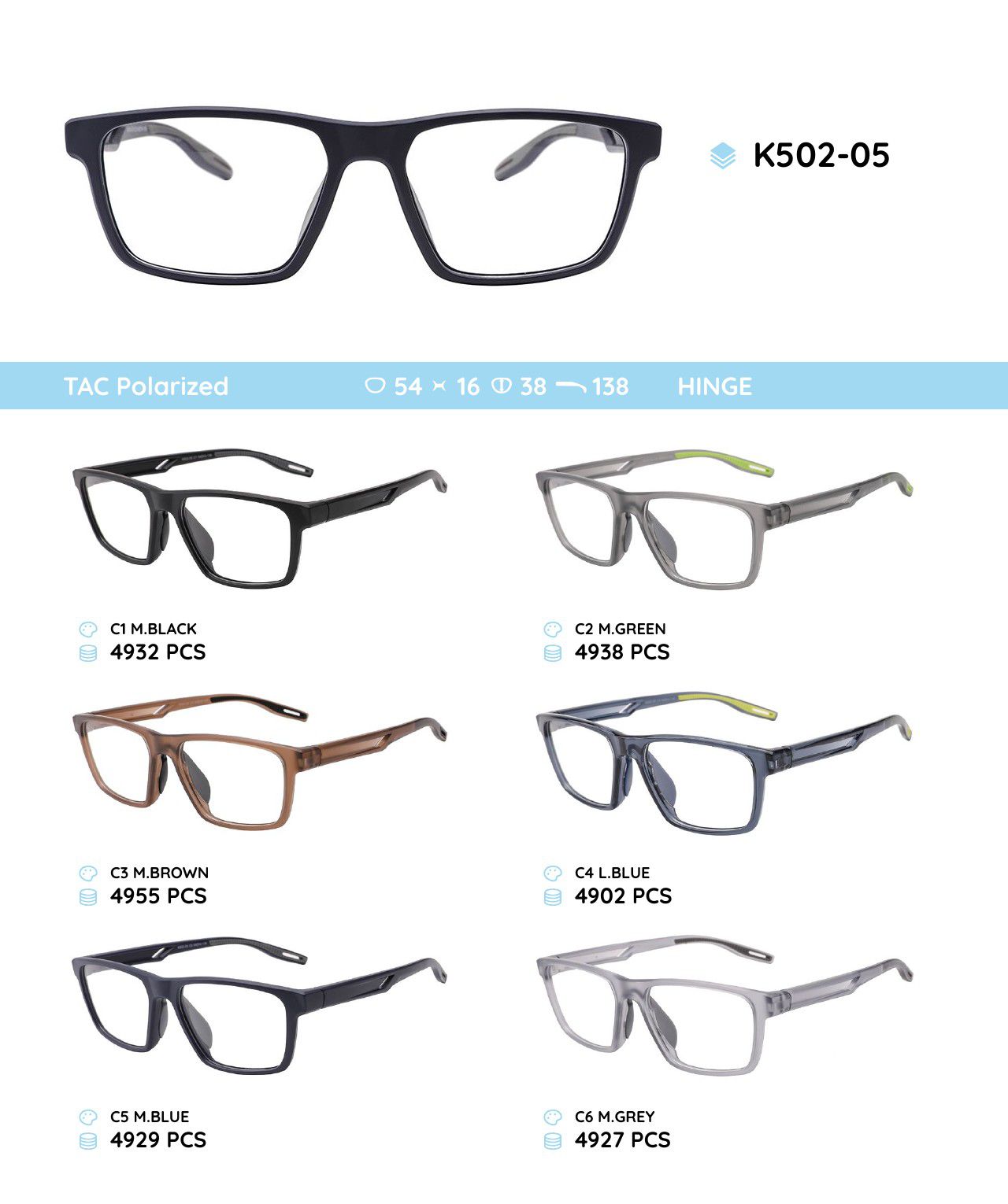 - Frame material: TR-90 plastic, silicone, metal