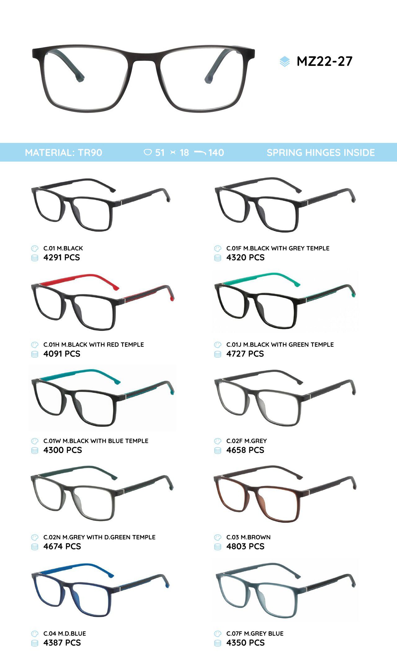 TR-90 plastic frames for glasses, with spring hinges MZ22-27