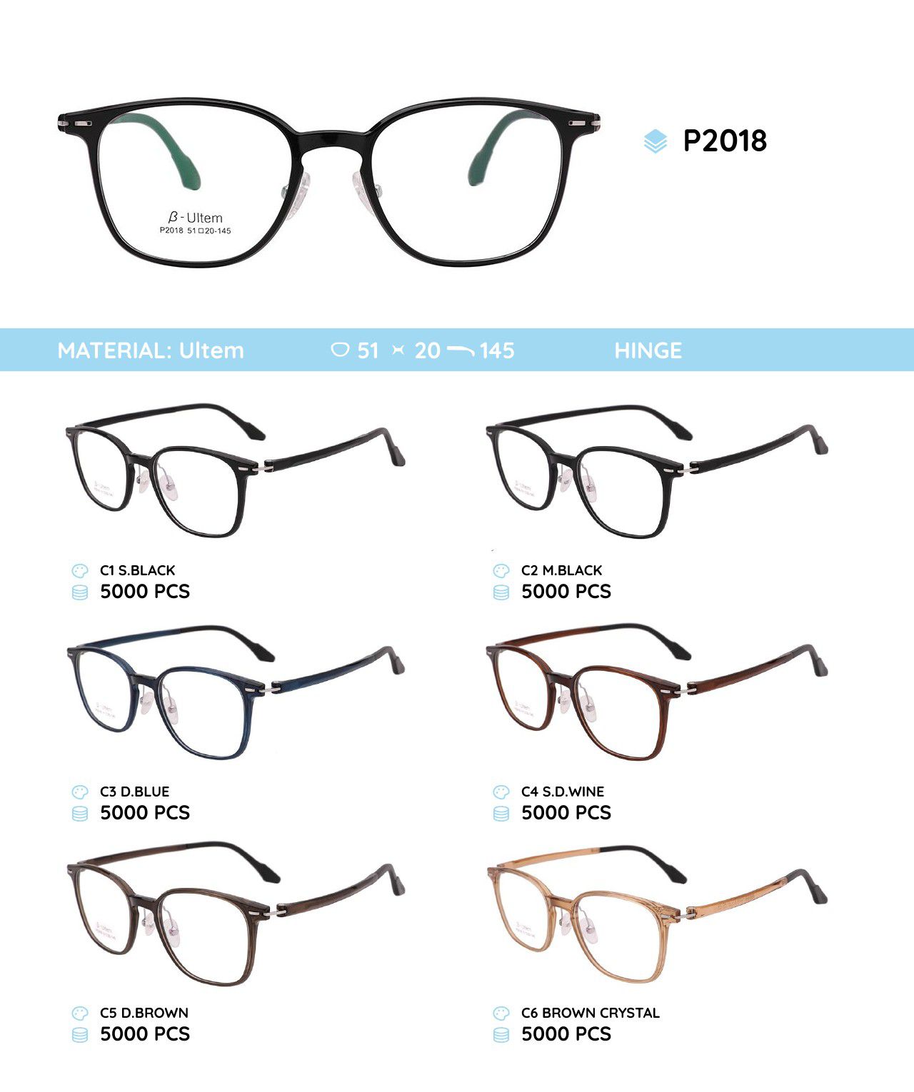 - Frame material: Ultem, metal