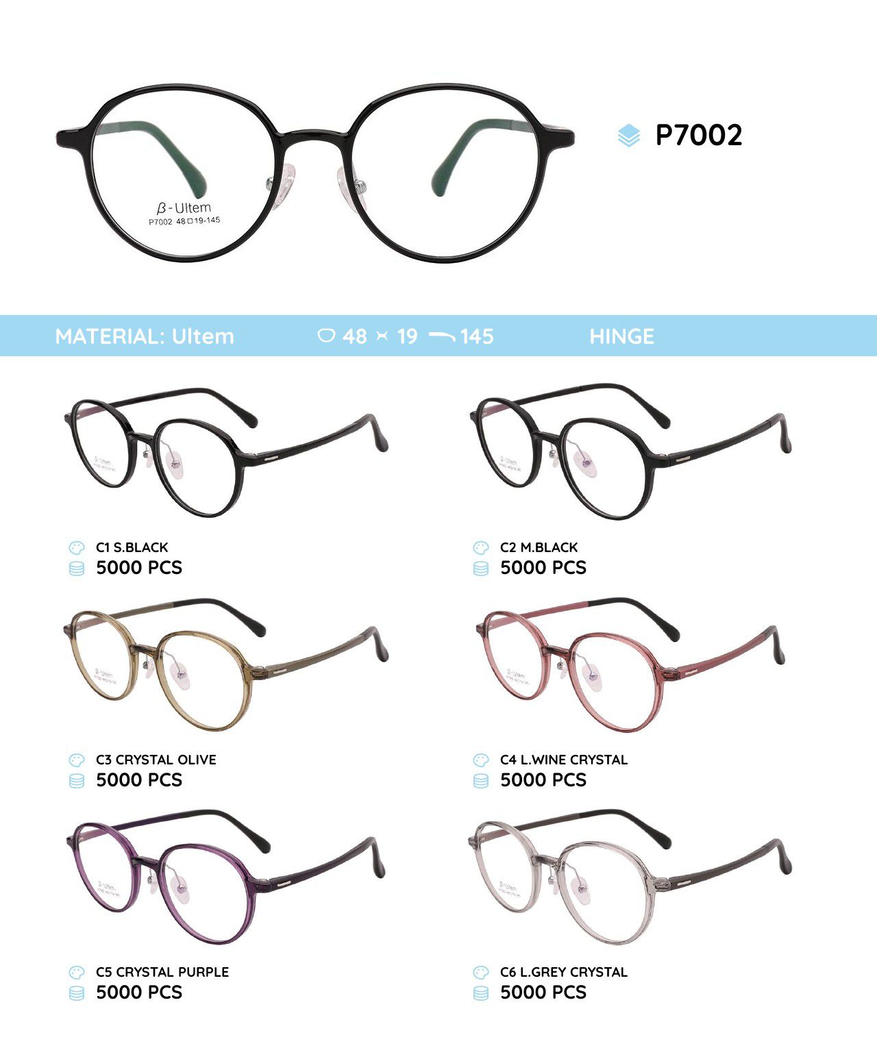 β-Ultem is a modern thermoplastic material (polyetherimide, PEI) used to make eyeglass frames. It combines lightweight construction with high strength, heat resistance up to 170°C, and flexibility with shape memory. The material is hypoallergenic, UV-resistant, and chemically resistant, ensuring durability and comfort. β-Ultem frames are suitable for active lifestyles, sports, and children, and allow for the creation of thin and elegant designs.