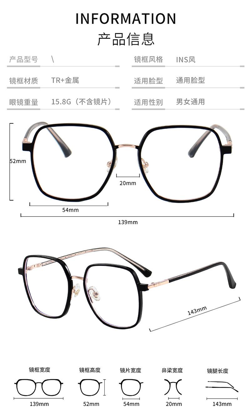 - Size: lens width - 54 mm, bridge - 20 mm, temple - 143 mm