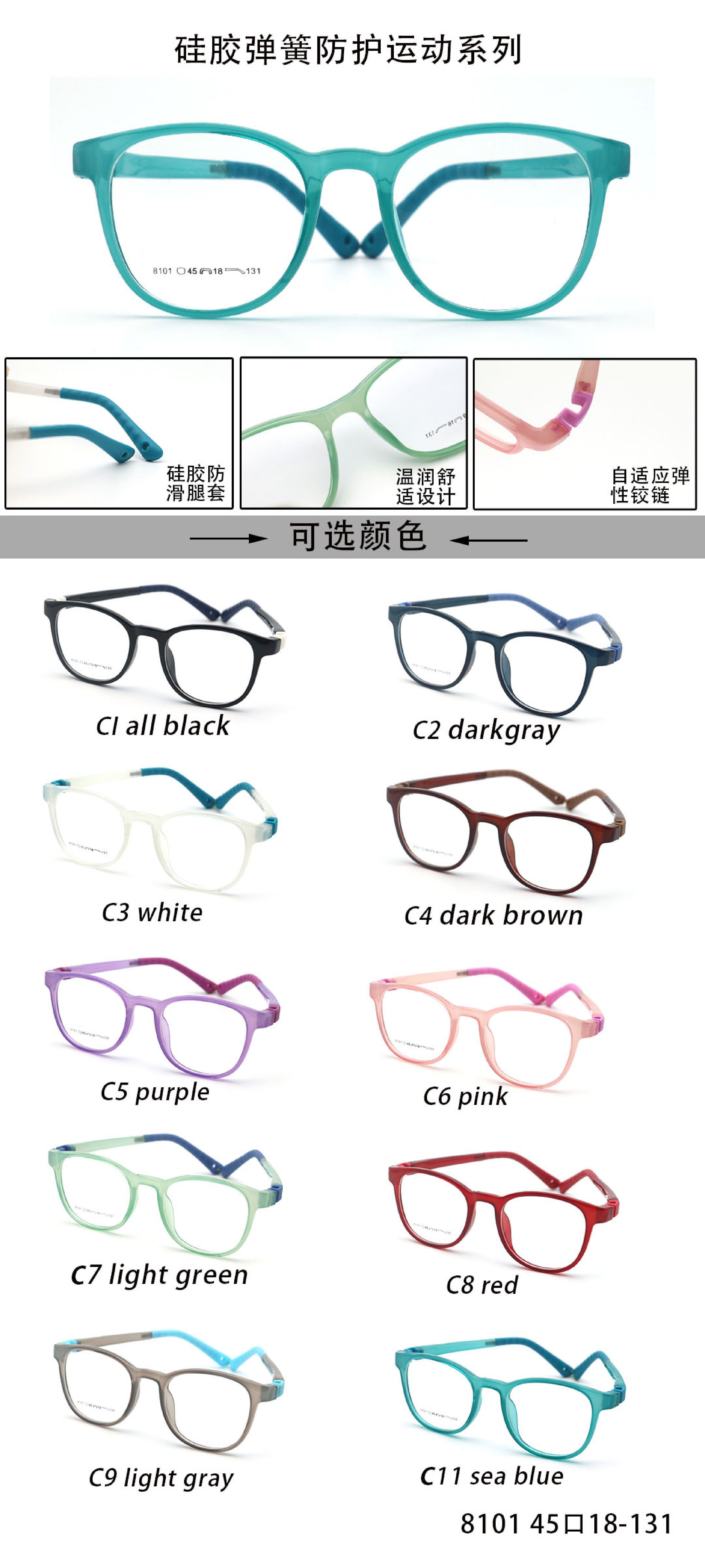 TR90 plastic eyeglasses frame for kids with silicone temple loop - replaces spring hinge TR8101