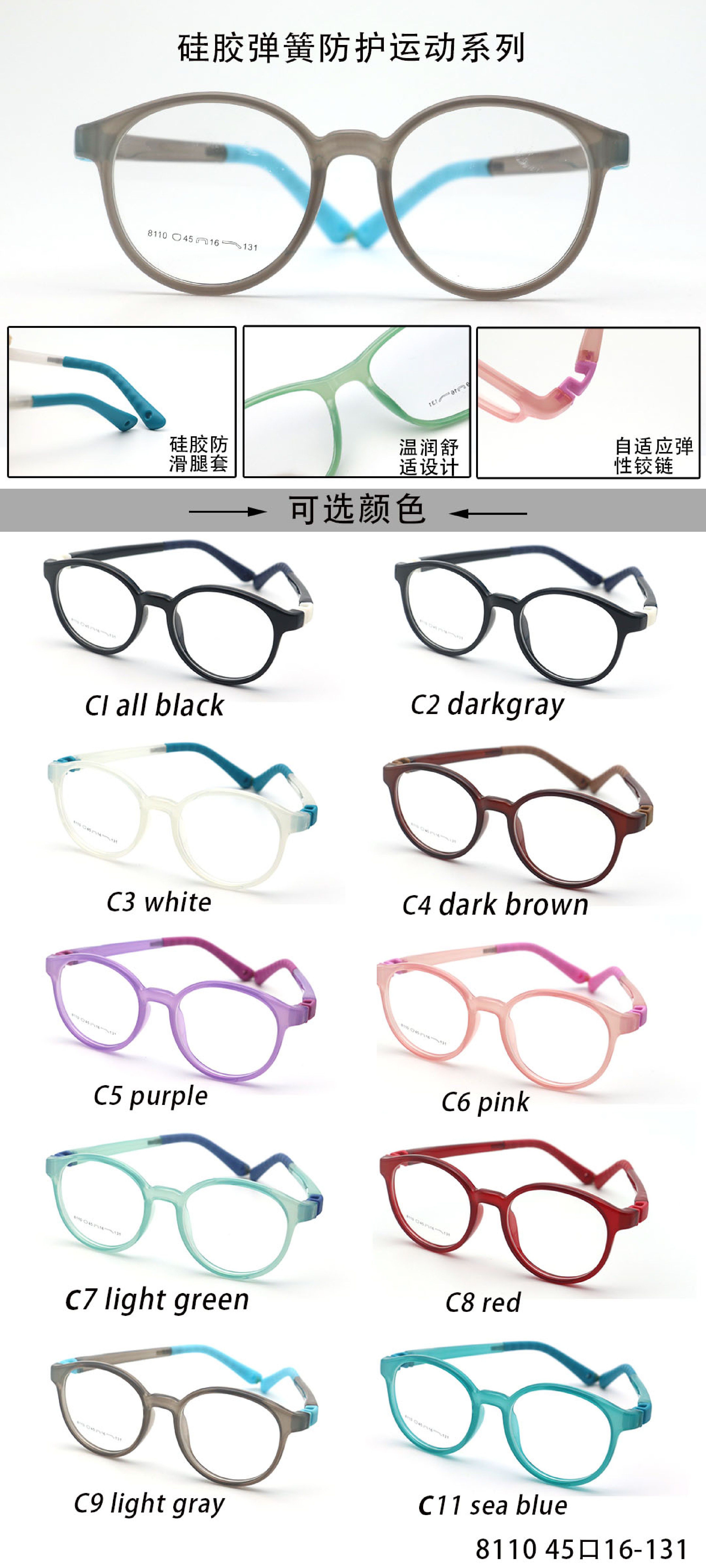 TR90 plastic eyeglasses frame for kids with silicone temple loop - replaces spring hinge TR8110
