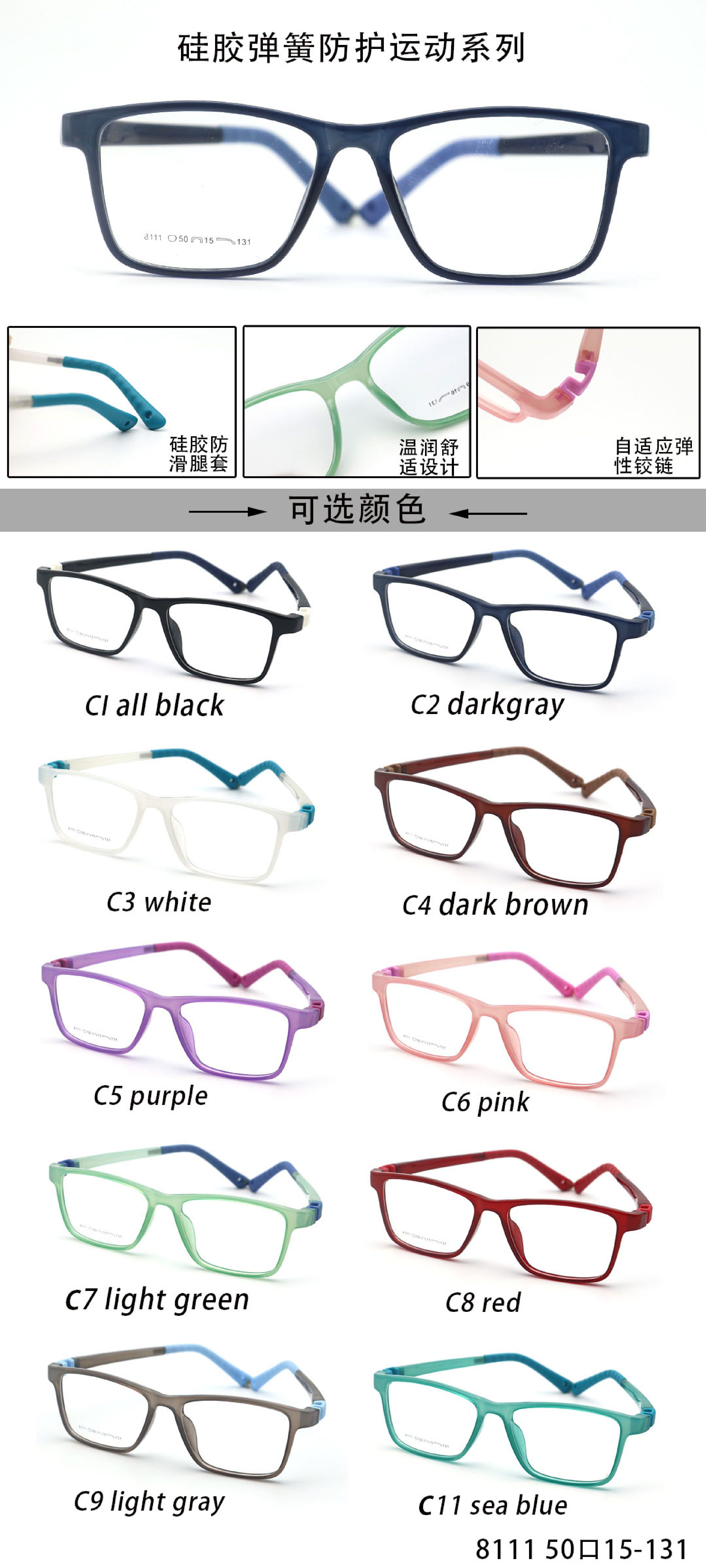 TR90 plastic eyeglasses frame for kids with silicone temple loop - replaces spring hinge TR8111