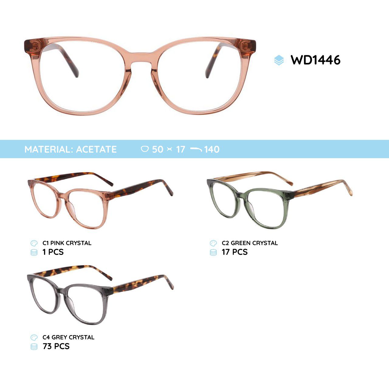 Glasses frames are plastic, acetate, milled. The frames hold their shape well, at the same time are flexible in use when making glasses, are of high quality, have pleasant tactile properties, are resistant to damage, are lightweight, and have hypoallergenic properties. Many models are decorated with rhinestones, with elegant temples and flex hinges. Fashionable design. This collection of high quality frames is individually controlled. Our store offers a low price for goods in this category for wholesale. CE standard (European Conformity).