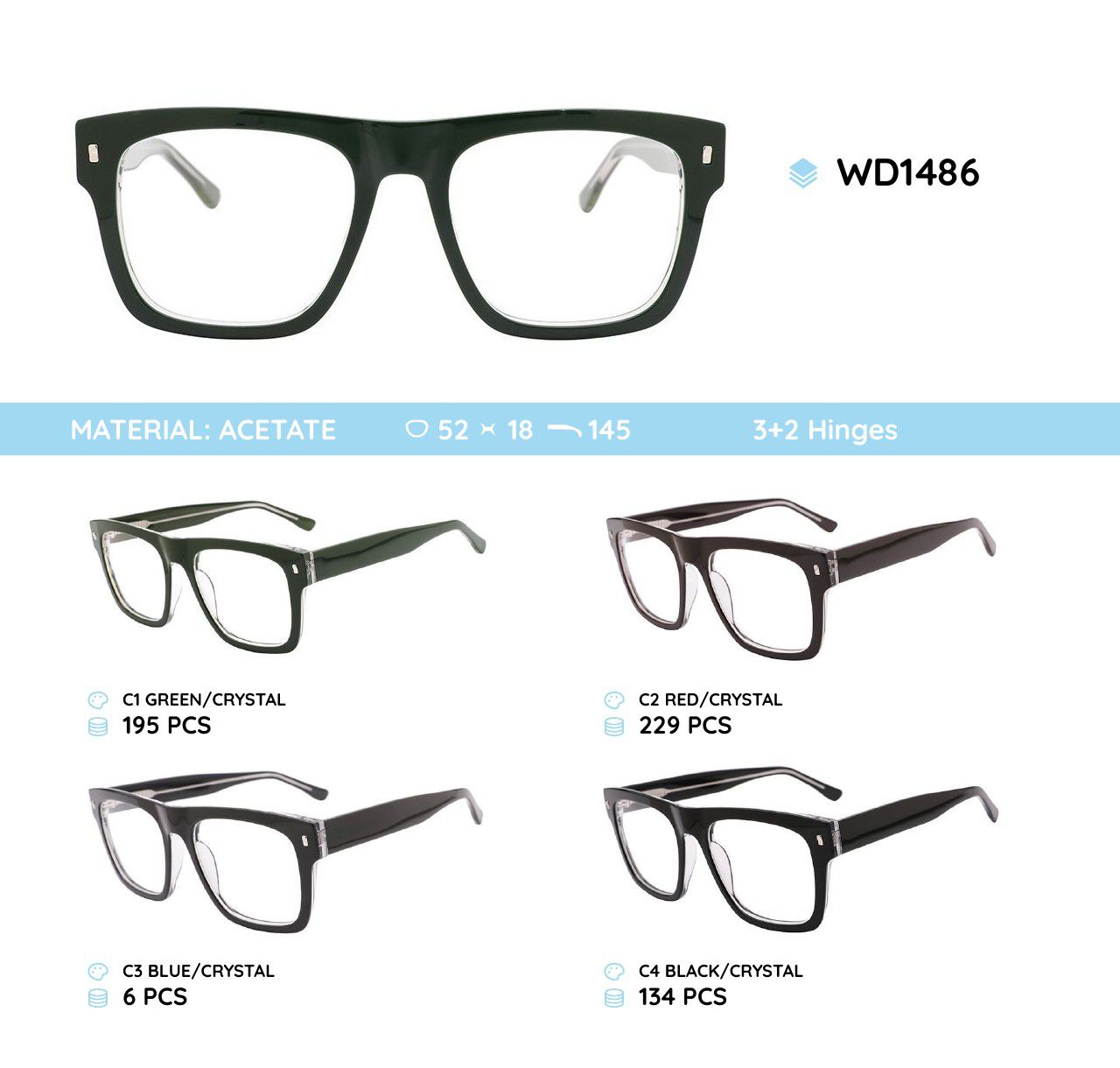Glasses frames are plastic, acetate, milled. The frames hold their shape well, at the same time are flexible in use when making glasses, are of high quality, have pleasant tactile properties, are resistant to damage, are lightweight, and have hypoallergenic properties. Many models are decorated with rhinestones, with elegant temples and flex hinges. Fashionable design. This collection of high quality frames is individually controlled. Our store offers a low price for goods in this category for wholesale. CE standard (European Conformity).