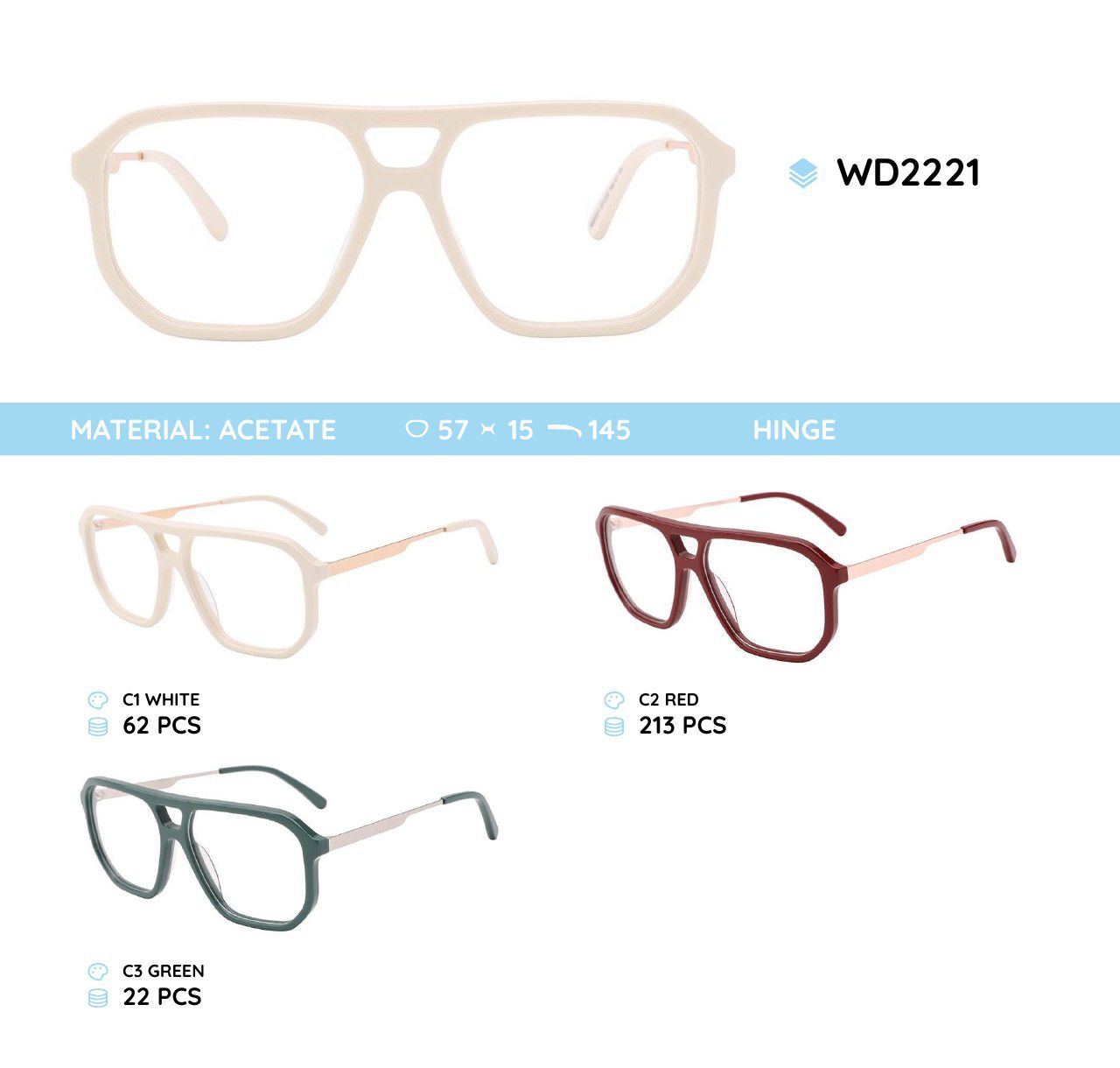 - Size: lens width - 57 mm, bridge distance - 15 mm, temple - 145 mm