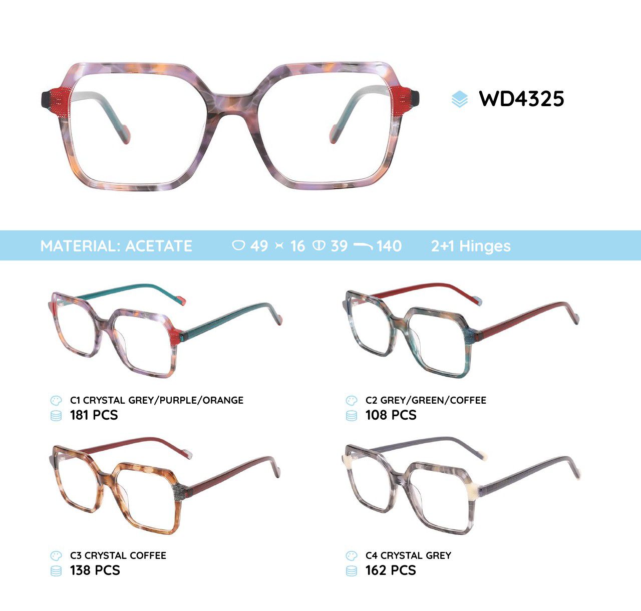 Glasses frames are plastic, acetate, milled. The frames hold their shape well, at the same time are flexible in use when making glasses, are of high quality, have pleasant tactile properties, are resistant to damage, are lightweight, and have hypoallergenic properties. Many models are decorated with rhinestones, with elegant temples and flex hinges. Fashionable design. This collection of high quality frames is individually controlled. Our store offers a low price for goods in this category for wholesale. CE standard (European Conformity).