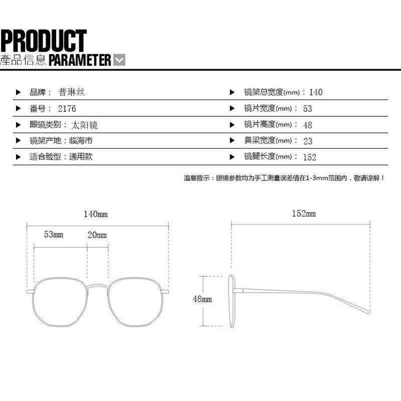 • Size: lens width - 53 mm, bridge - 20 mm, temple length - 152 mm