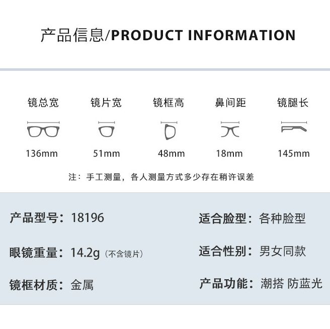 - Size: lens width - 51 mm, bridge - 18 mm, temple length - 145 mm