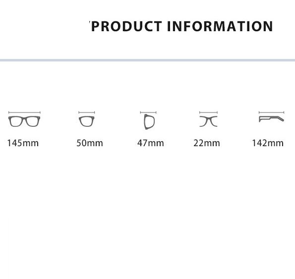 - Size: total width - 145 mm, lens width - 50 mm, lens height - 47 mm, bridge - 22 mm, temple length - 142 mm