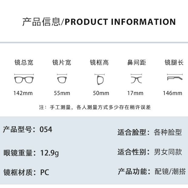 - Size: total width - 142 mm, lens width - 55 mm, lens height - 50 mm, bridge - 17 mm, temple length - 146 mm