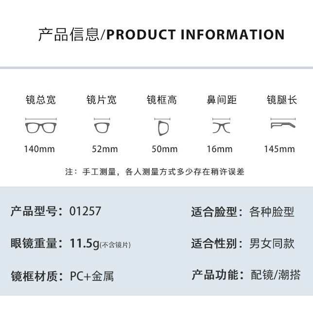 - Size: total width - 140 mm, lens width - 52 mm, lens height - 50 mm, bridge - 16 mm, temple length - 145 mm