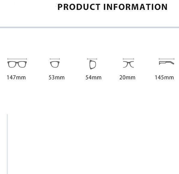 - Size: total width - 147 mm, lens width - 53 mm, lens height - 54 mm, bridge - 20 mm, temple length - 145 mm