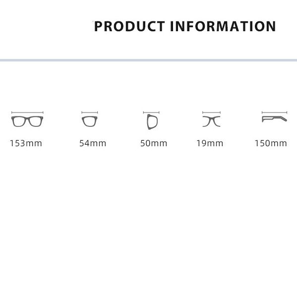 - Size: total width - 153 mm, lens width - 54 mm, lens height - 50 mm, bridge - 19 mm, temple length - 150 mm