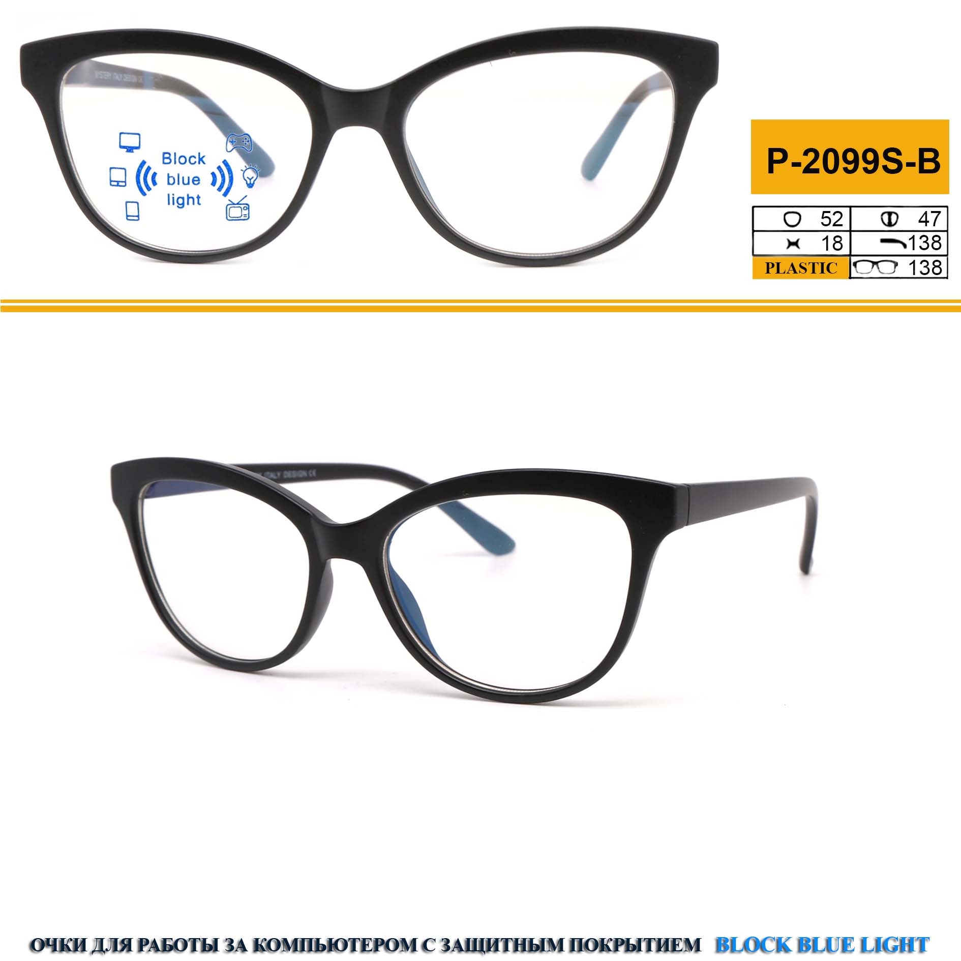 黑框防兰光电脑镜 Plastic blue-blocker glasses for computer working Mystery P-2099S-B (soft case and manual included)