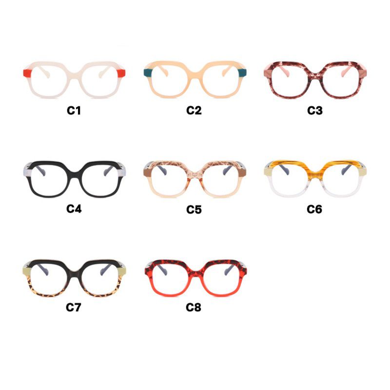 A collection of fashionable Blue Ray Cut eyeglass frames featuring a modern, minimalist style. These lightweight, comfortable, and durable frames are suitable for both blue light-blocking and vision correction lenses. The selection includes a variety of shapes: round, oval, rectangular, and a combination of both and a wide range of colors, from classic black and clear to vibrant shades. These frames complement any look, are suitable for everyday wear, work, and school, and thanks to high-quality materials, they provide durability and comfort.