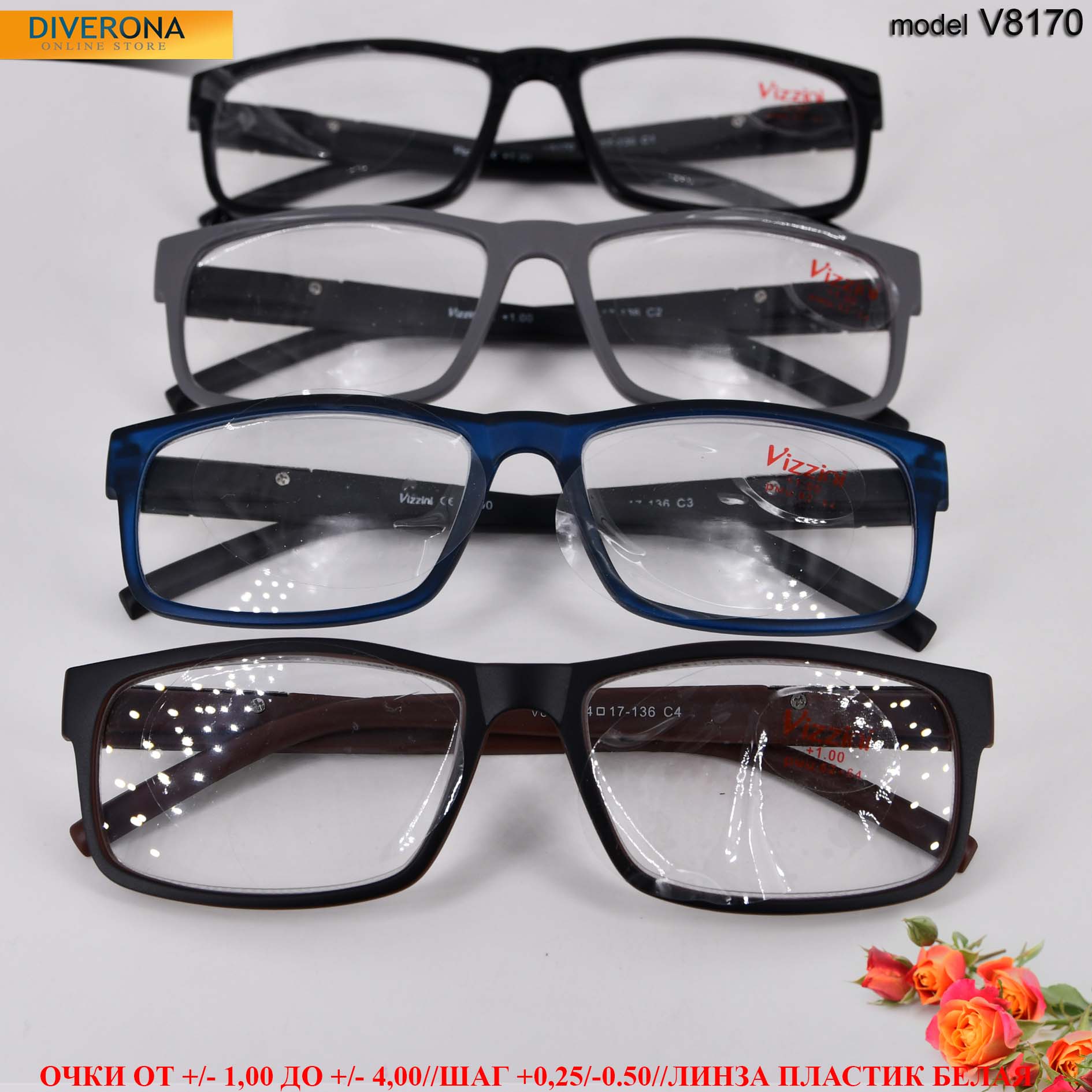 Plastic frame glasses for men VIZZINI V8170, from +0.75 to +4,00 (step 0,25)