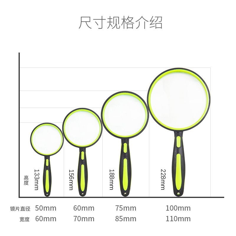 Magnifier, magnifying glass with handle 双色橡胶柄放大镜-4-XX, diameter 50mm, 60mm, 75mm, 100mm, magnification: 10Х, 8Х, 6Х, 5Х