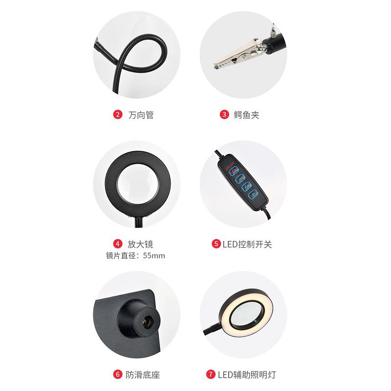 The desktop magnifier is a multifunctional device, indispensable for soldering, assembling small parts, jewelry work and other tasks that require high precision. Equipped with several magnification levels, it allows you to examine even the tiniest elements in detail. The main feature of the model is the locking holders that provide stable fixation of objects, freeing your hands for work. The kit includes replaceable attachments that expand the functionality of the device. Thanks to the robust design and stable base, the magnifier is reliable and easy to use. The perfect choice for craftsmen, radio amateurs and jewelers who need a precision tool for detailed processing.