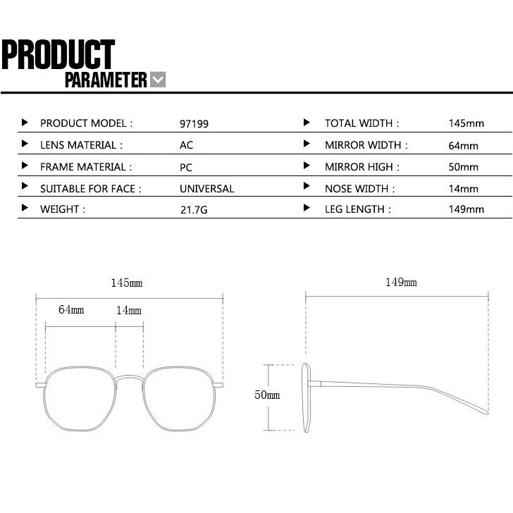 • Размер: ширина линзы - 64 мм, мост - 14 мм, длина заушника - 149 мм