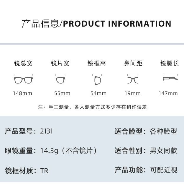 • Размер: общая ширина -148 мм, ширина линзы - 55 мм, высота линзы - 54 мм, мост - 19 мм, длина заушника - 147 мм