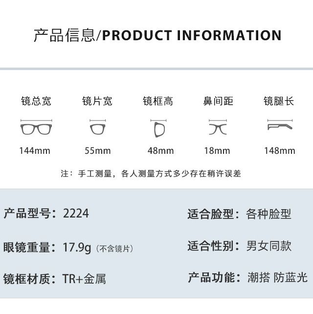 - Размер: общая ширина -144 мм, ширина линзы - 55 мм, высота линзы - 48 мм, мост - 18 мм, длина заушника - 148 мм
