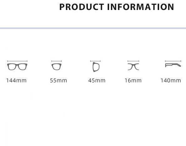 - Размер: общая ширина -144 мм, ширина линзы - 55 мм, высота линзы - 45 мм, мост - 16 мм, длина заушника - 140 мм