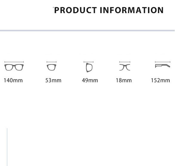 - Размер: общая ширина -140 мм, ширина линзы - 53 мм, высота линзы - 49 мм, мост - 18 мм, длина заушника - 152 мм