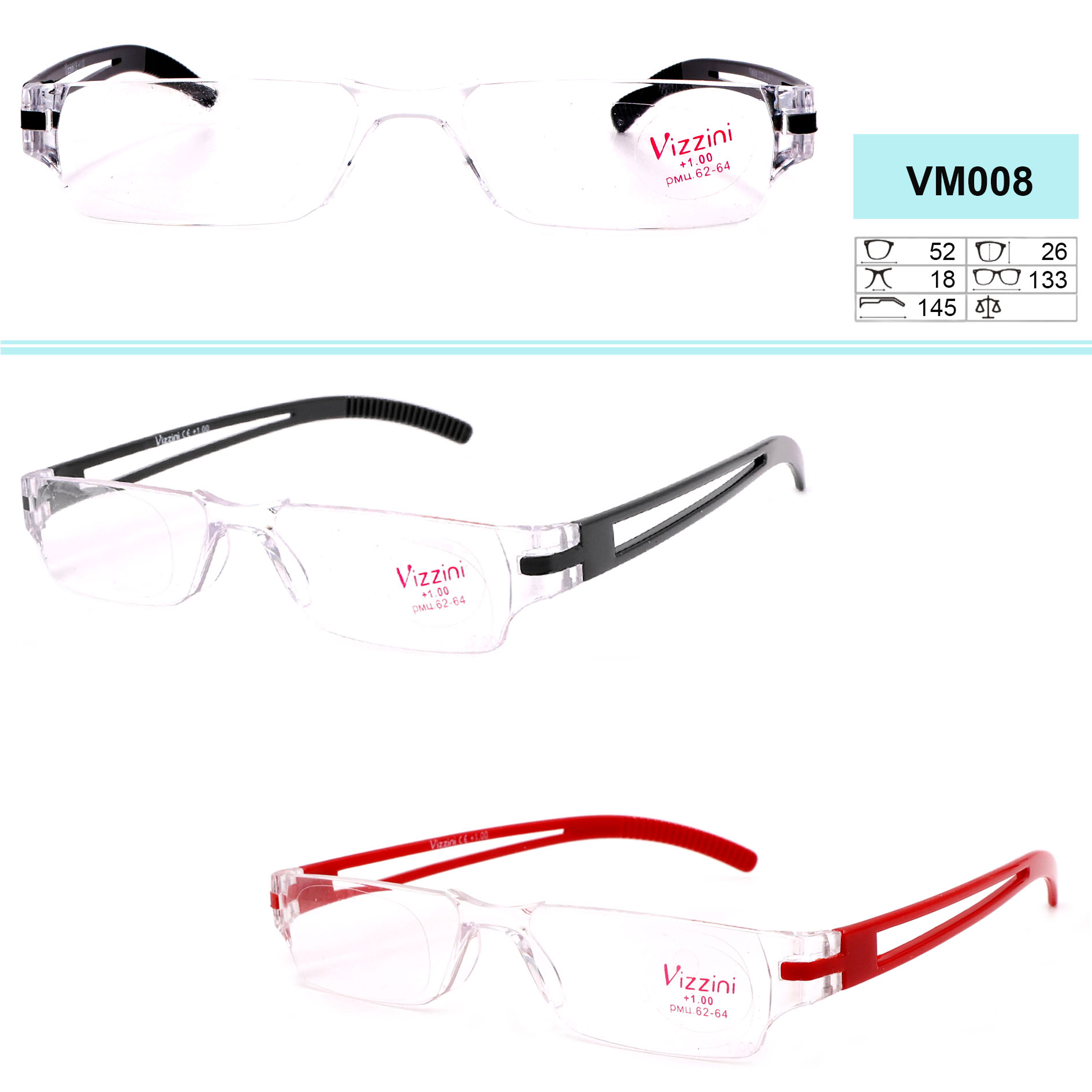 Очки корригирующие Vizzini в пластиковой оправе (ободковые, безободковые, на леске, в футляре и без футляра, мужские, женские, унисекс). Линзы в очках центрованы 62-64. Предложены варианты по цвету линз. Выбирайте. Рекомендуем для оптовой и розничной продажи.