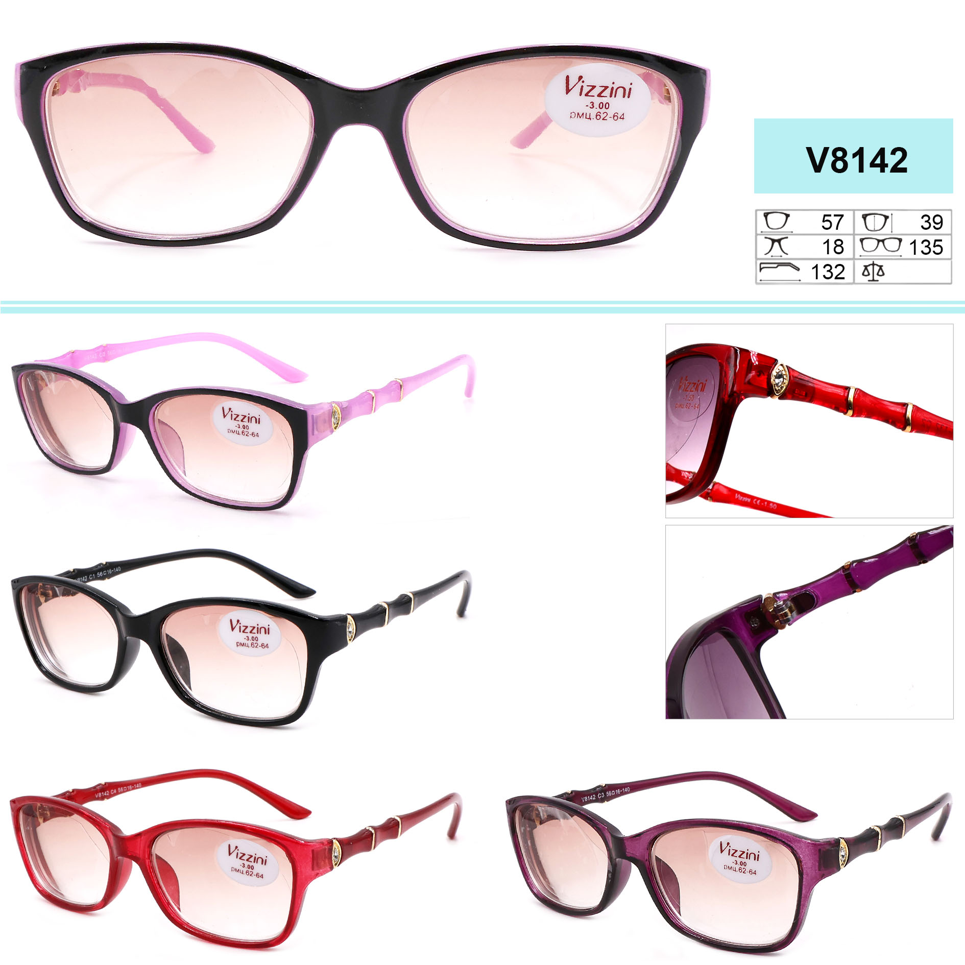 Очки в пластиковой оправе VIZZINI V8142 диоптрии -1,00 до -8,00 (шаг 0,5) с цветными линзами,стразы V8142 -5.5 Grey lens 灰色片 ¥ 11.00 В наличии
