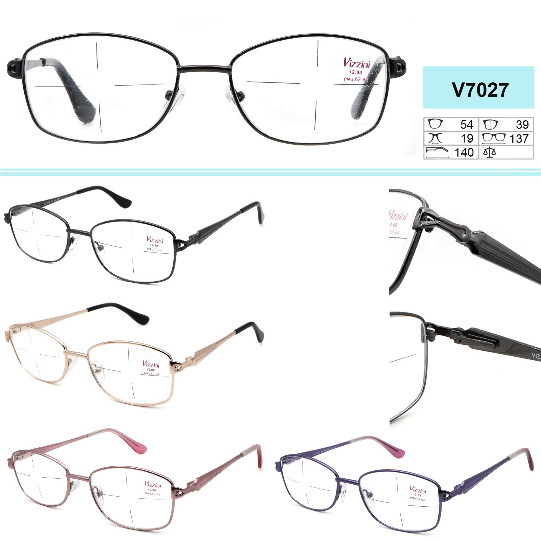 Очки готовые в металлической оправе Vizzini V7027, линзы пластик, диоптрии +0.75 до +6.00 (шаг 0.25)