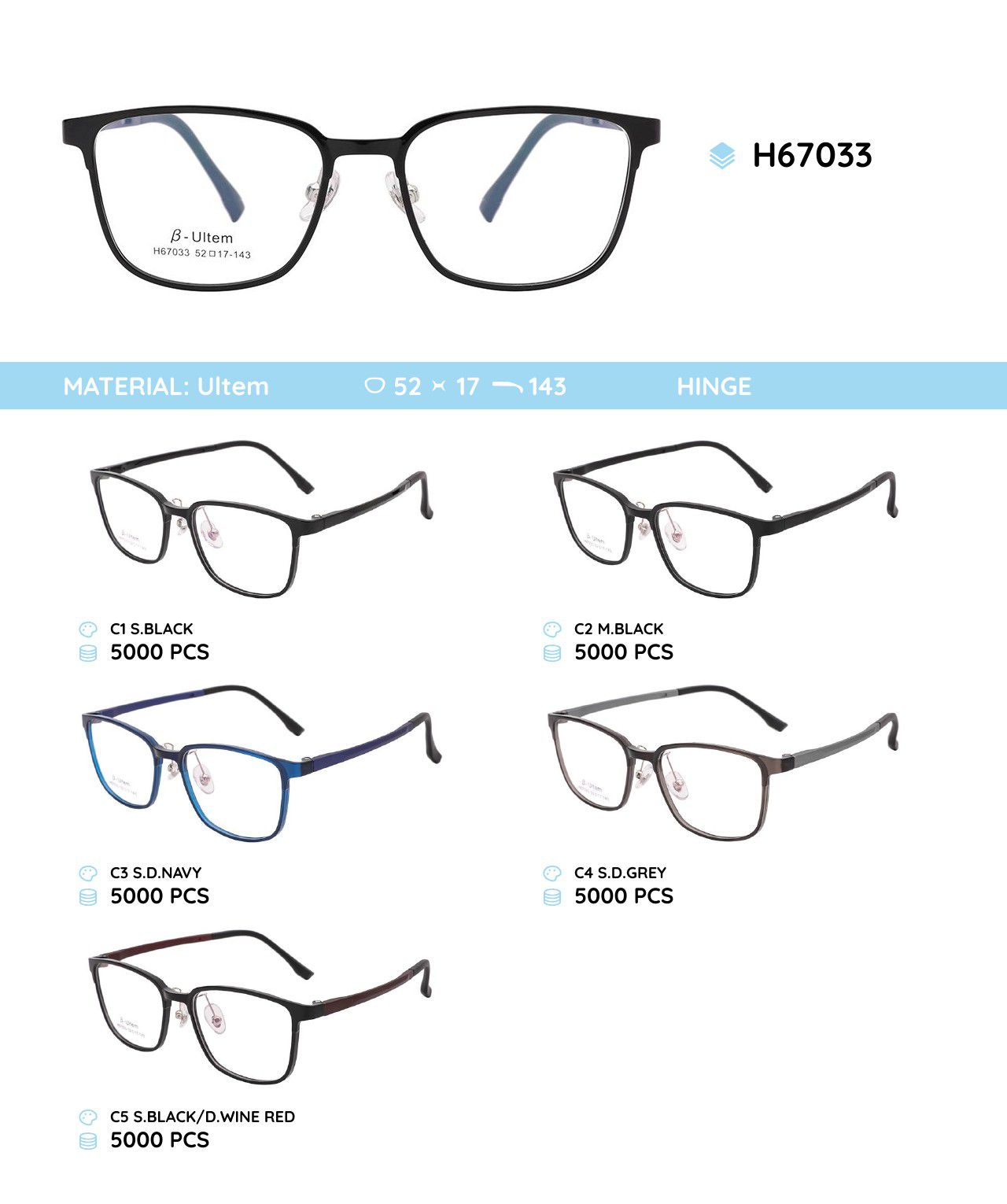 β‑Ultem — это современный термопластичный материал (полиэфиримид, PEI), применяемый для изготовления оправ очков. Он сочетает лёгкость, высокую прочность, термостойкость до 170 °C и гибкость с «памятью формы». Материал гипоаллергенен, устойчив к ультрафиолету и химическим воздействиям, что обеспечивает долговечность и комфорт при носке. Оправы из β‑Ultem подходят для активного образа жизни, спорта и детей, а также позволяют создавать тонкие и изящные конструкции.