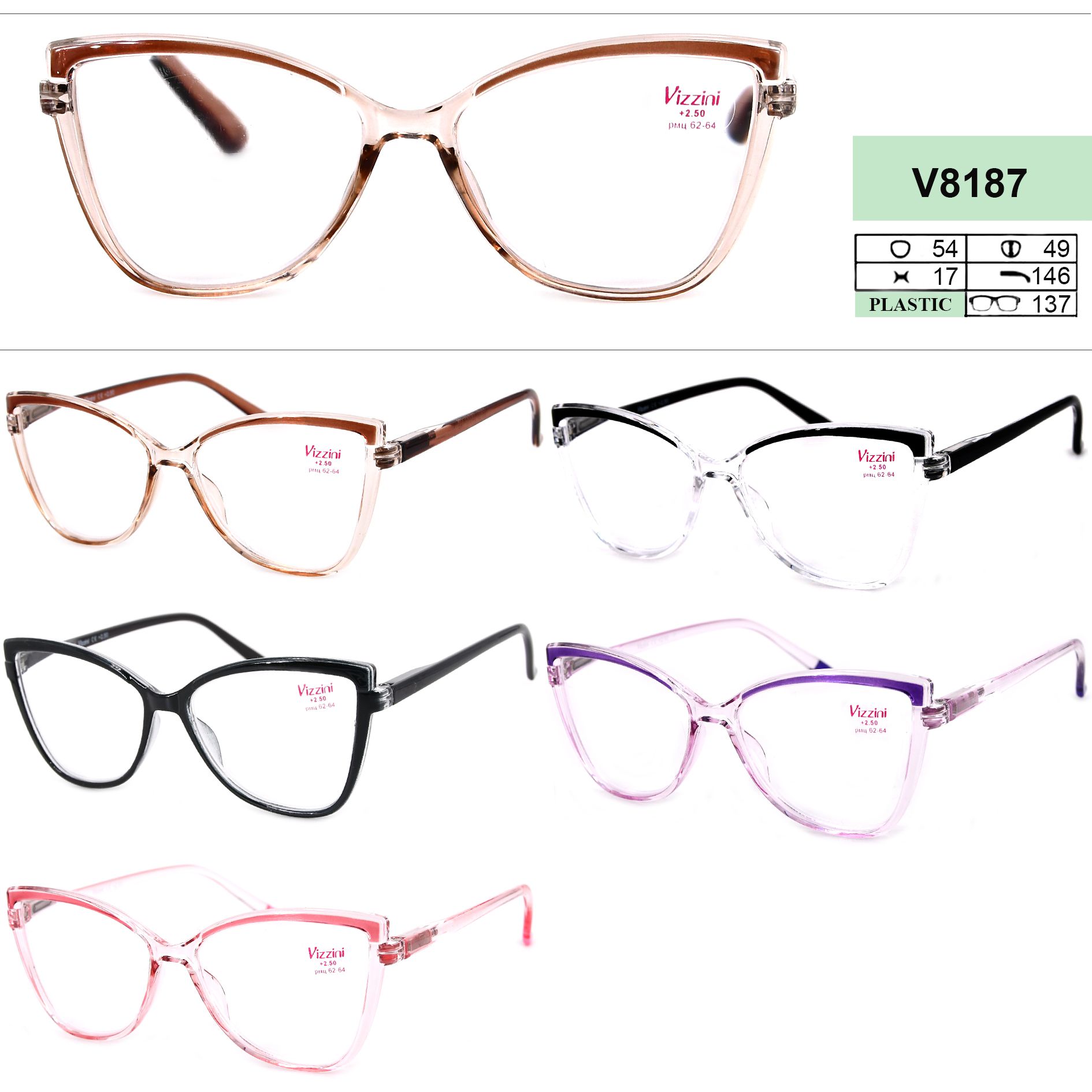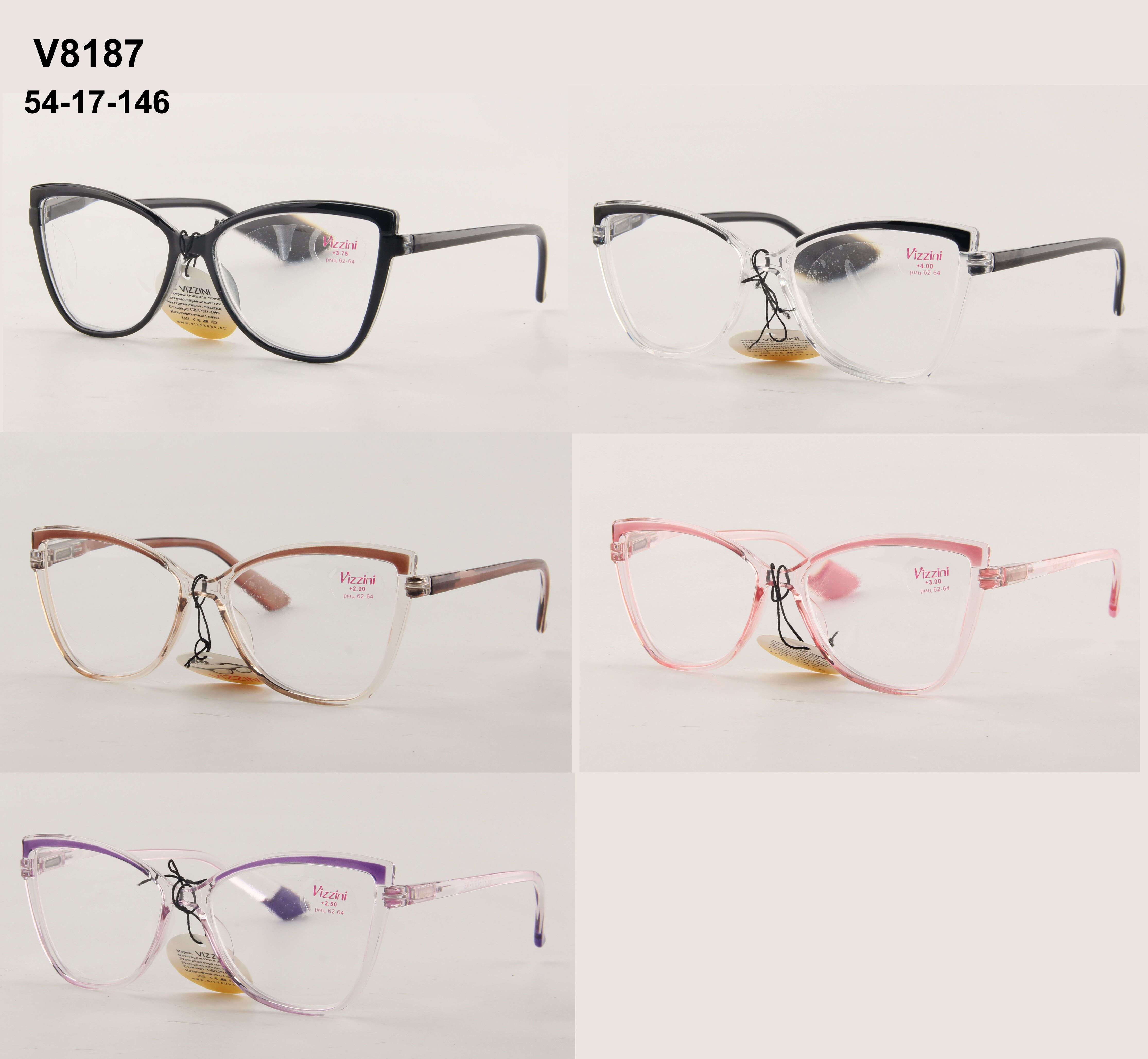 Ready-made plastic frame glasses for women Vizzini V8187, diopters from +1.00 to +4.00 (step 0.25); from -1.00 to -4.00 (step 0.5)