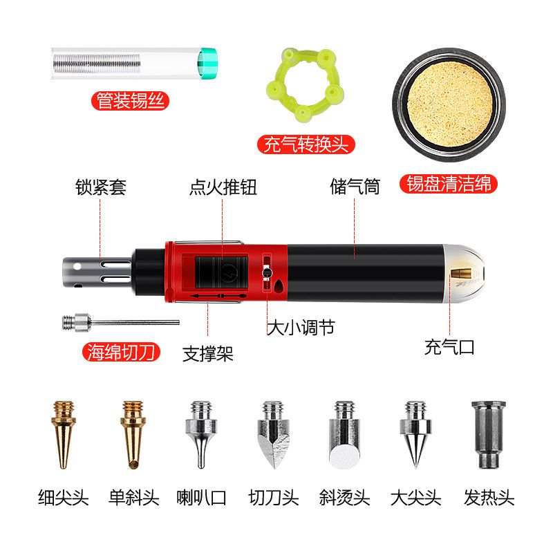 Portable gas soldering pen with additional accessories.
