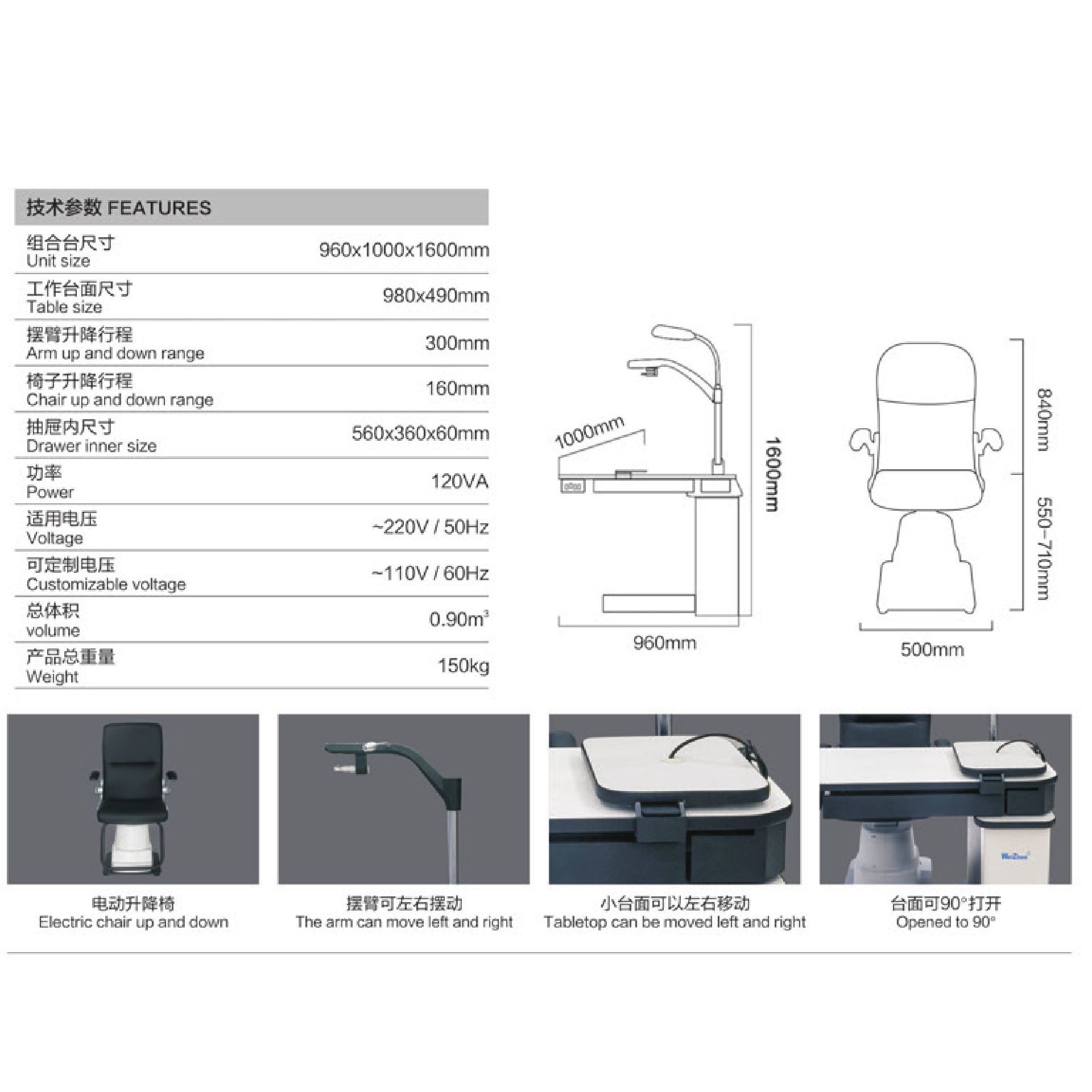 Модель включает в себя всё необходимое для проведения офтальмологических обследований. Удобная столешница с выдвижным ящиком и электроподъёмным механизмом регулировки по высоте. В верхней части рабочего места офтальмолога располагается лампа, угол наклона которой можно изменять. Для закрепления фороптера и проектора предусмотрены встроенные кронштейны. В комплект входит кресло.