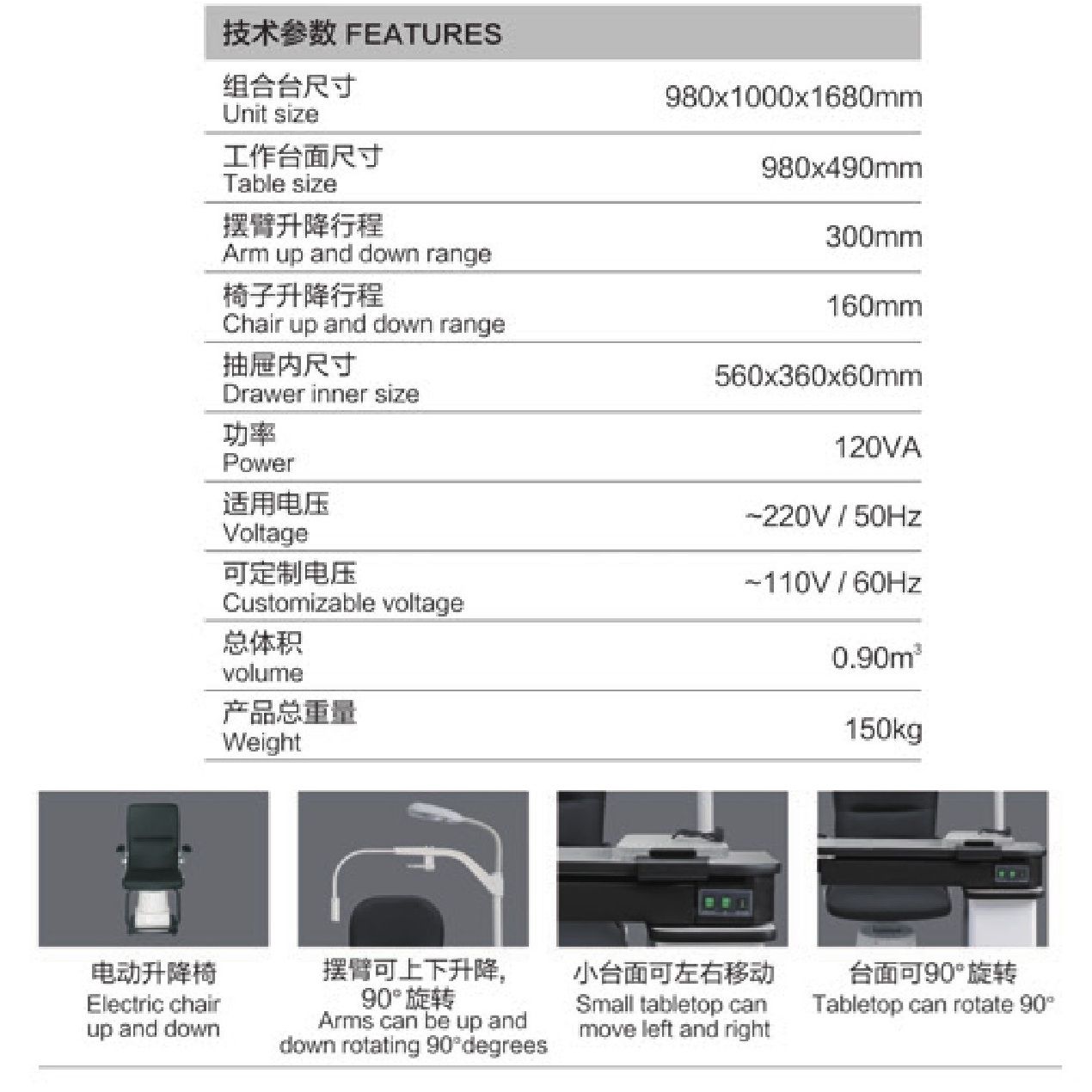 Модель включает в себя всё необходимое для проведения офтальмологических обследований. Удобная столешница с выдвижным ящиком и электроподъёмным механизмом регулировки по высоте. В верхней части рабочего места офтальмолога располагается лампа, угол наклона которой можно изменять. Для закрепления фороптера и проектора предусмотрены встроенные кронштейны. В комплект входит кресло.