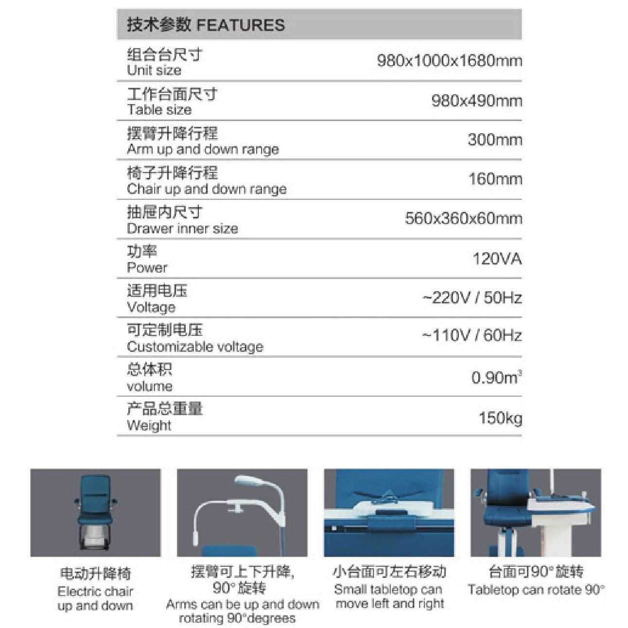 Модель включает в себя всё необходимое для проведения офтальмологических обследований. Удобная столешница с выдвижным ящиком и электроподъёмным механизмом регулировки по высоте. В верхней части рабочего места офтальмолога располагается лампа, угол наклона которой можно изменять. Для закрепления фороптера и проектора предусмотрены встроенные кронштейны. В комплект входит кресло.