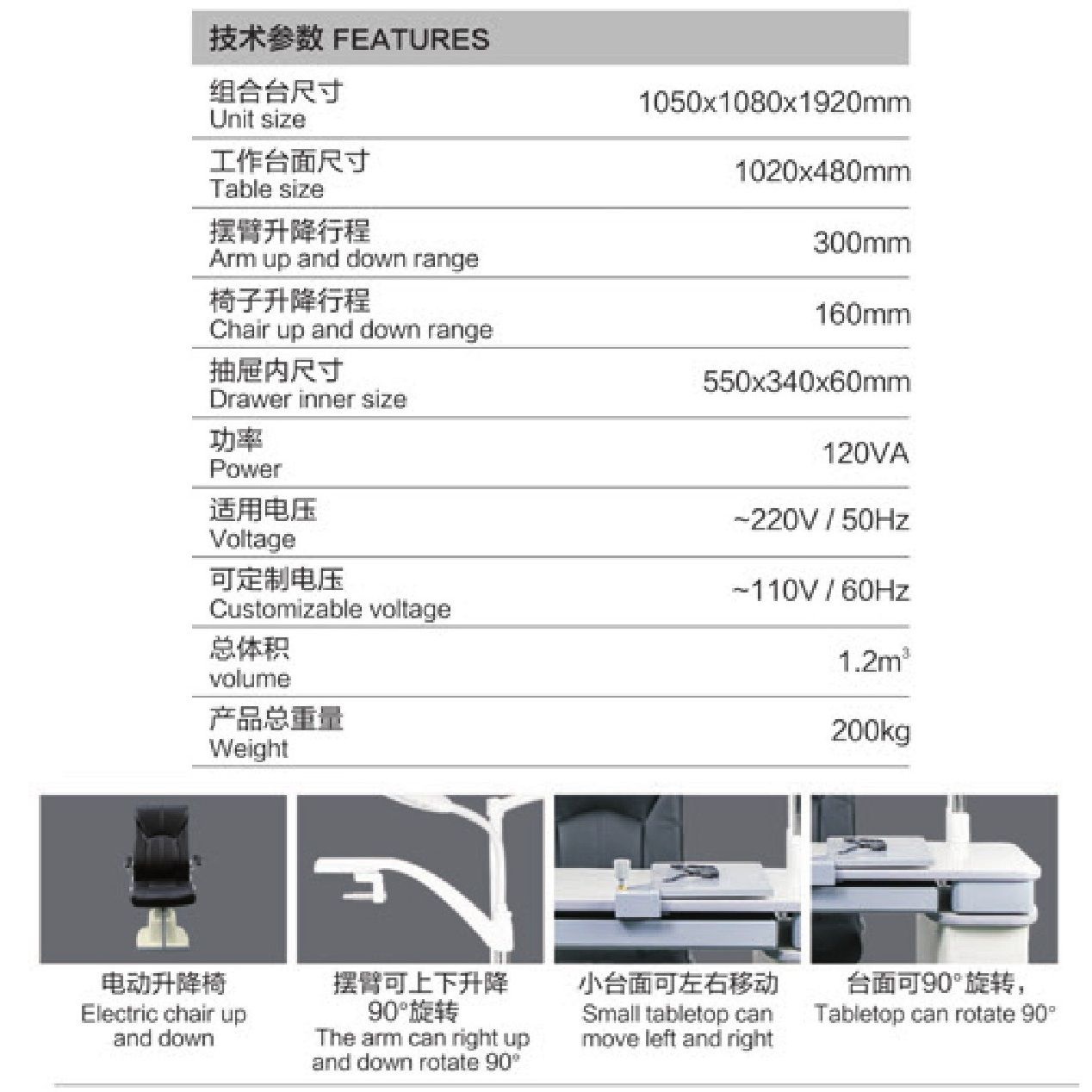 Модель включает в себя всё необходимое для проведения офтальмологических обследований. Удобная столешница с выдвижным ящиком и электроподъёмным механизмом регулировки по высоте. В верхней части рабочего места офтальмолога располагается лампа, угол наклона которой можно изменять. Для закрепления фороптера и проектора предусмотрены встроенные кронштейны. В комплект входит кресло.
