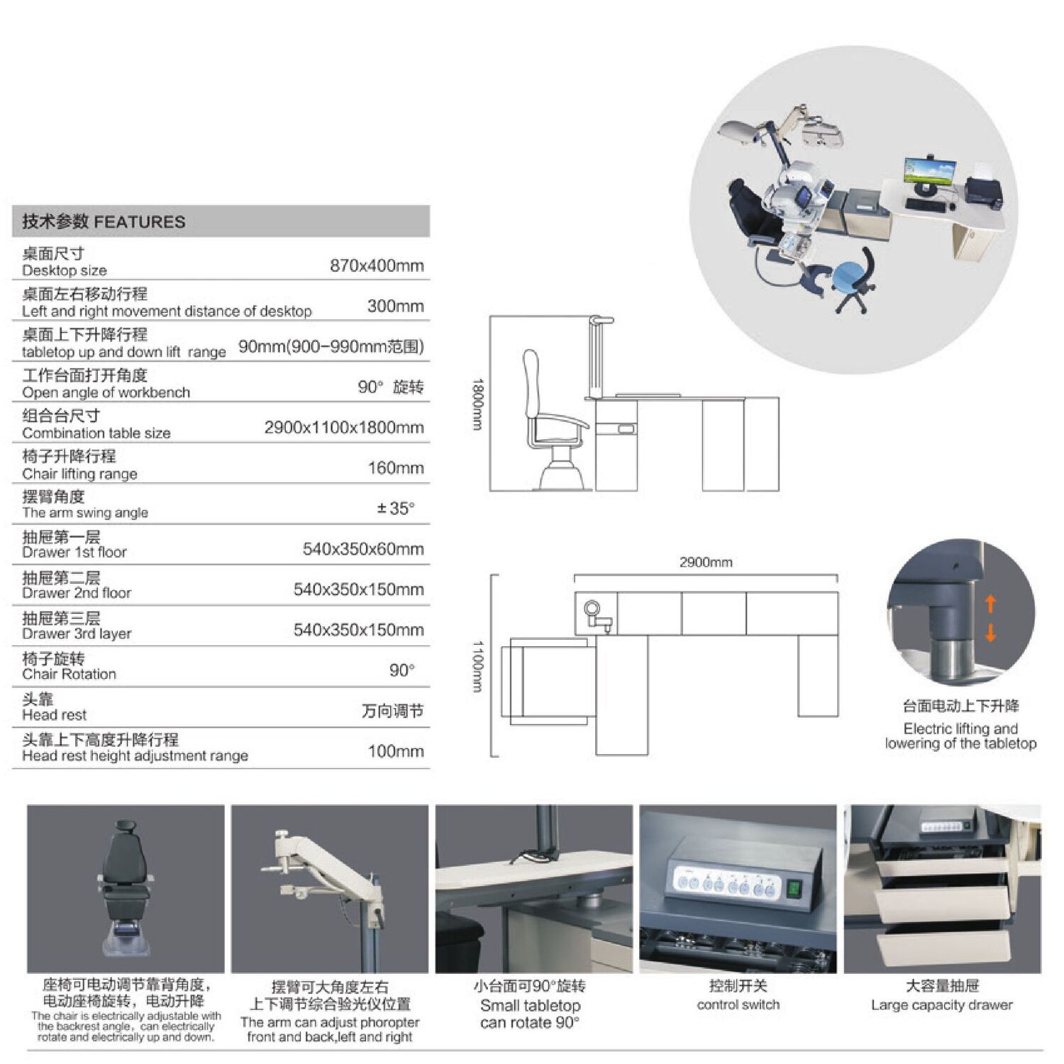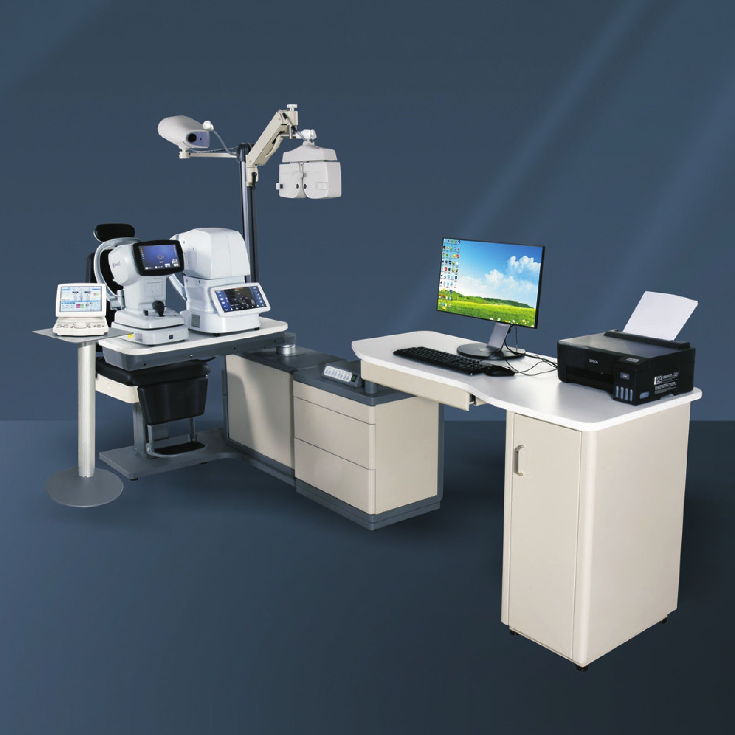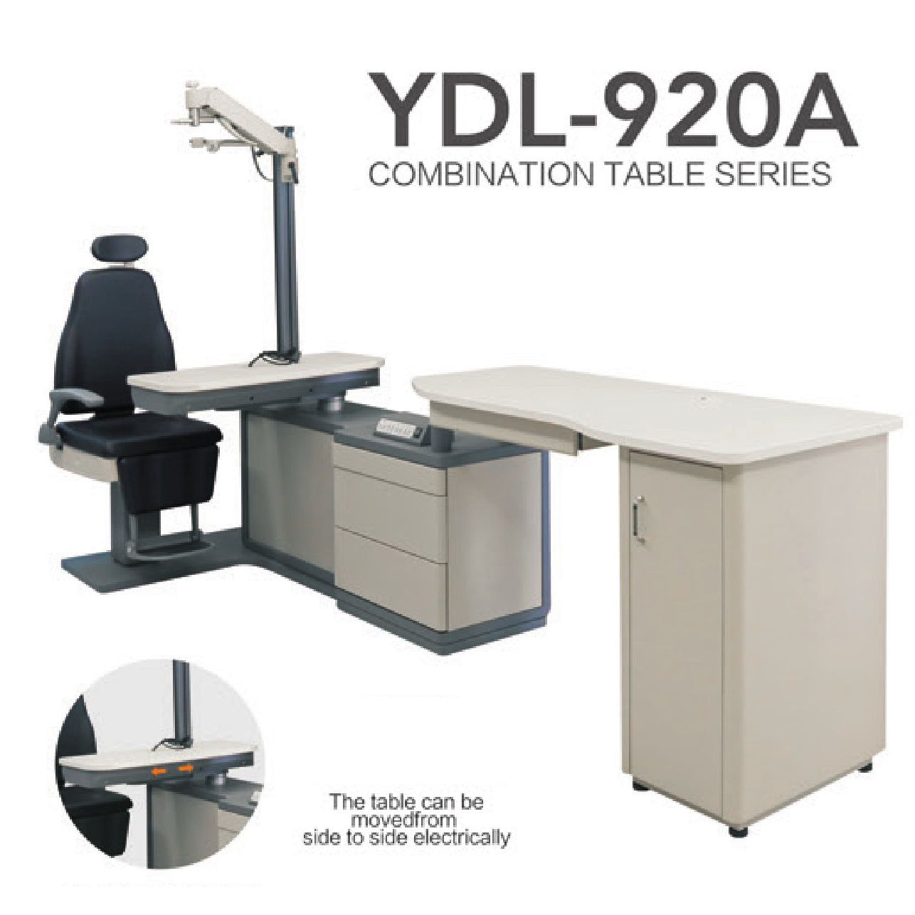 Рабочее место офтальмолога, комбинированный стол с сенсорным управлением + кресло YDL-920A, столешница 870*400 мм