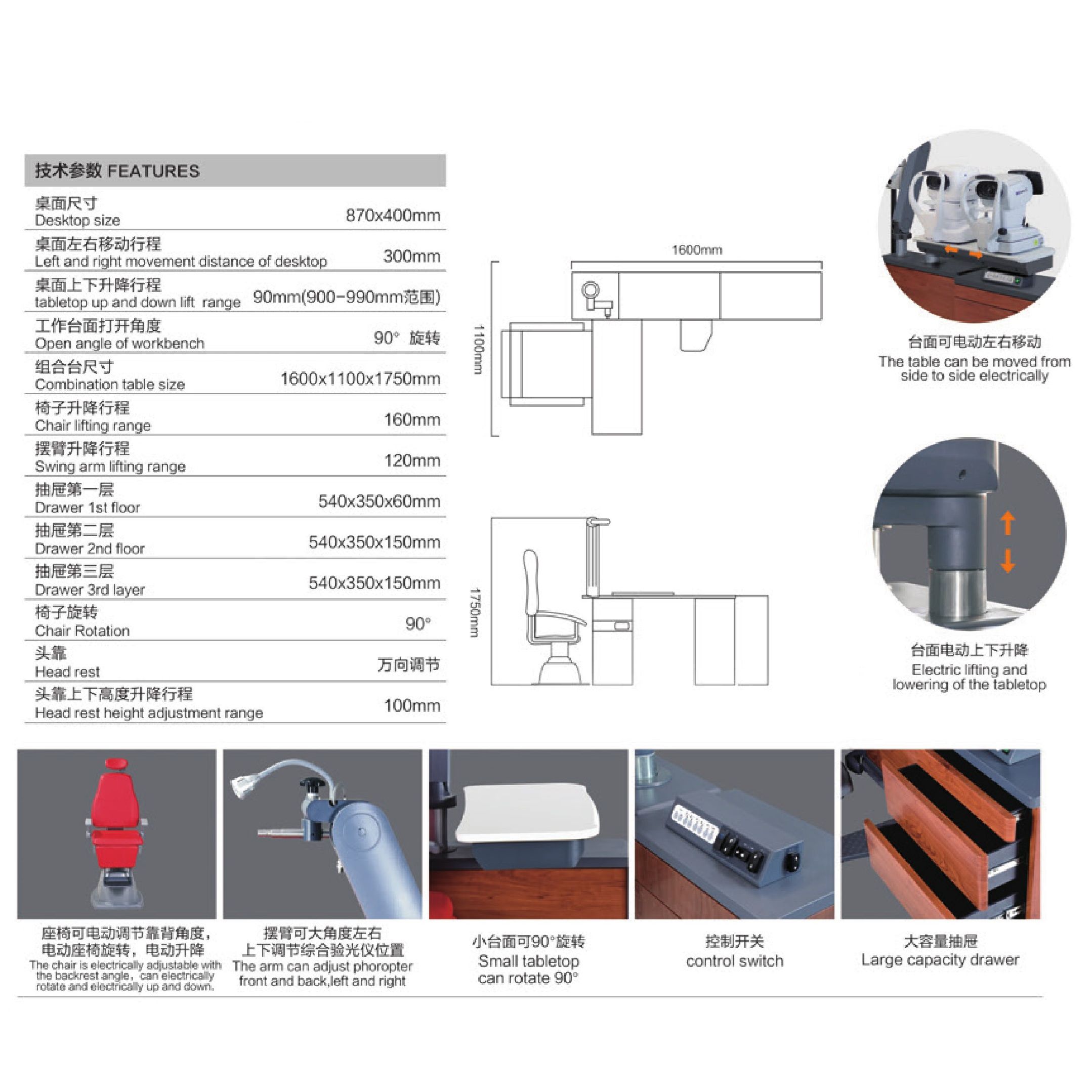 Рабочее место офтальмолога, комбинированный стол с сенсорным управлением + кресло YDL-930, столешница 870*400 мм