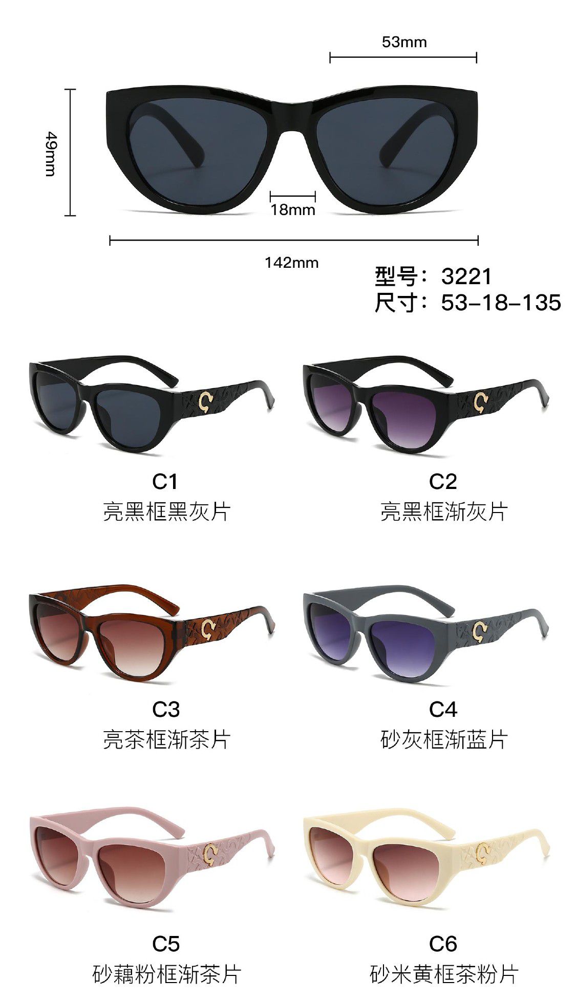 - Size: lens width - 53 mm, bridge distance - 18 mm, temple - 135 mm