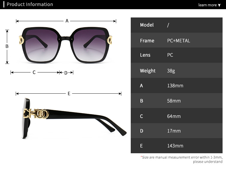 - Size: lens width - 64 mm, bridge distance - 17 mm, temple - 143 mm