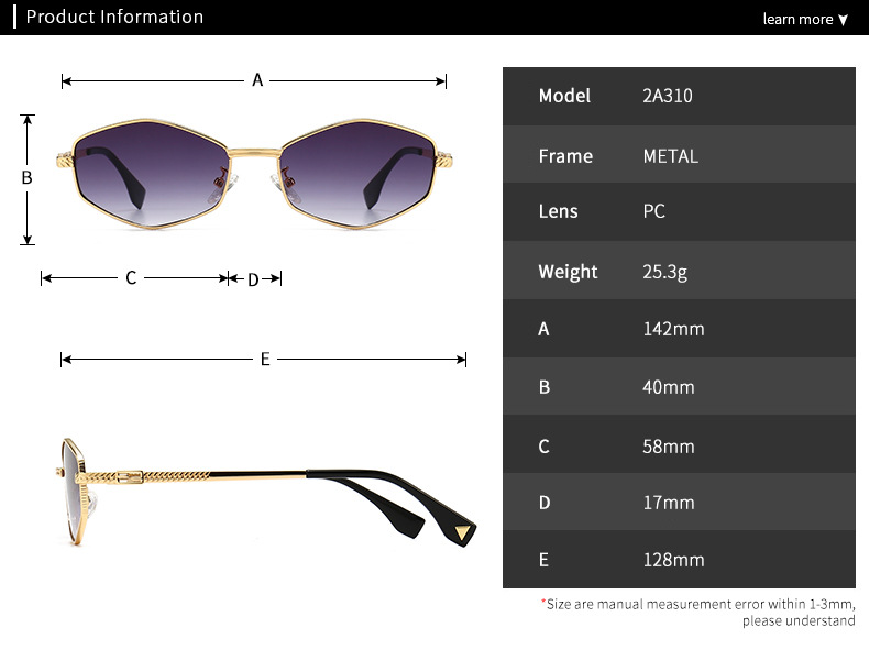 - Size: lens width - 58 mm, bridge distance - 17 mm, temple - 128 mm