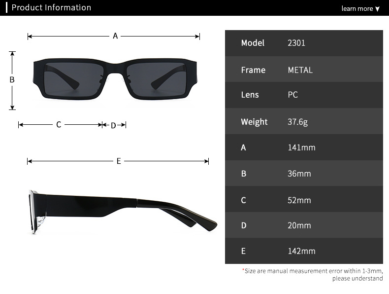 - Size: lens width - 52 mm, bridge distance - 20 mm, temple - 142 mm
