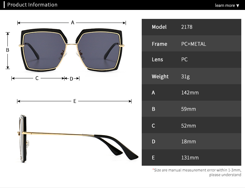 - Size: lens width - 52 mm, bridge distance - 18 mm, temple - 131 mm
