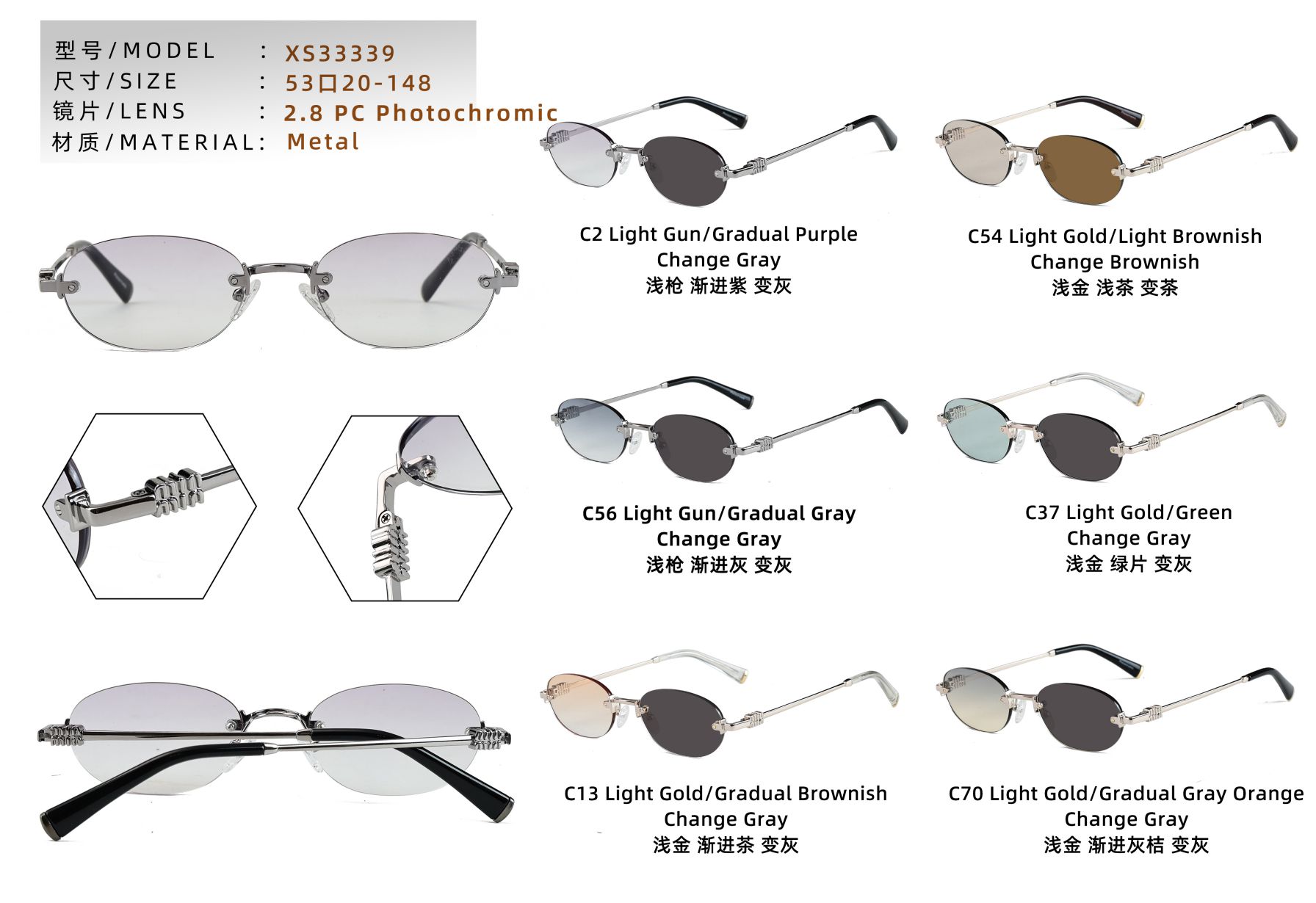 - Size: lens width - 53 mm, bridge distance - 20 mm, temple - 148 mm